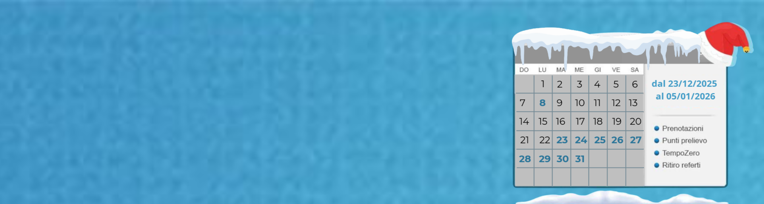 Durante il periodo invernale e Natalizio, dal 22/12/2025 al 06/01/2026 alcune attività delle strutture del Gruppo MultiMedica subiranno delle riduzioni di orario.