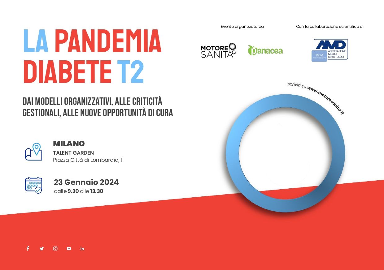 Martedì 23 gennaio, dalle 9.30 alle 11.30, si terrà presso il Talent Garden di Piazza Città di Lombardia, 1 a Milano, il convegno “La Pandemia Diabete T2. Dai modelli organizzativi, alle criticità gestionali, alle nuove opportunità di cura”.