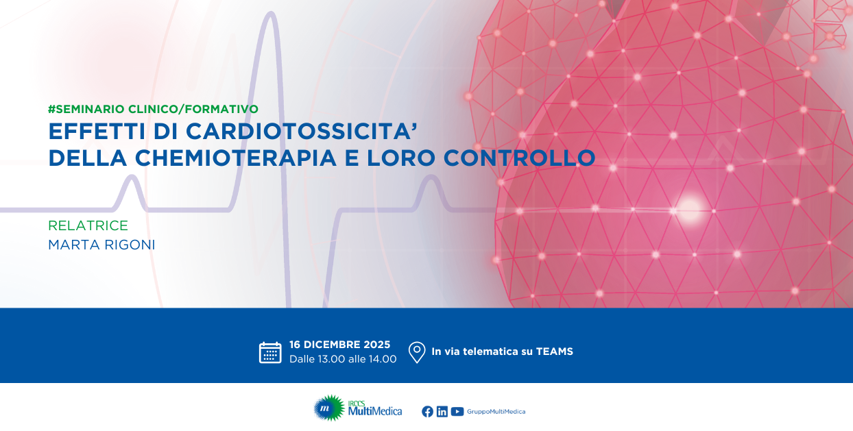 Martedì 16 dicembre 2025 dalle ore 13.00 alle 14.00 si terrà il seminario clinico-formativo “Effetti di cardiotossicità della chemioterapia e loro controllo”.
