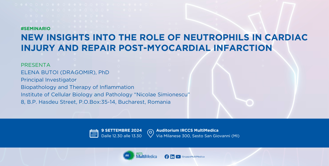 Lunedì 9 Settembre 2024 dalle ore 12.30 alle 13.30 presso l’Auditorium dell’IRCCS MultiMedica di Sesto San Giovanni si terrà il seminario “New insights into the role of neutrophils in cardiac injury and repair post-myocardial infarction”.